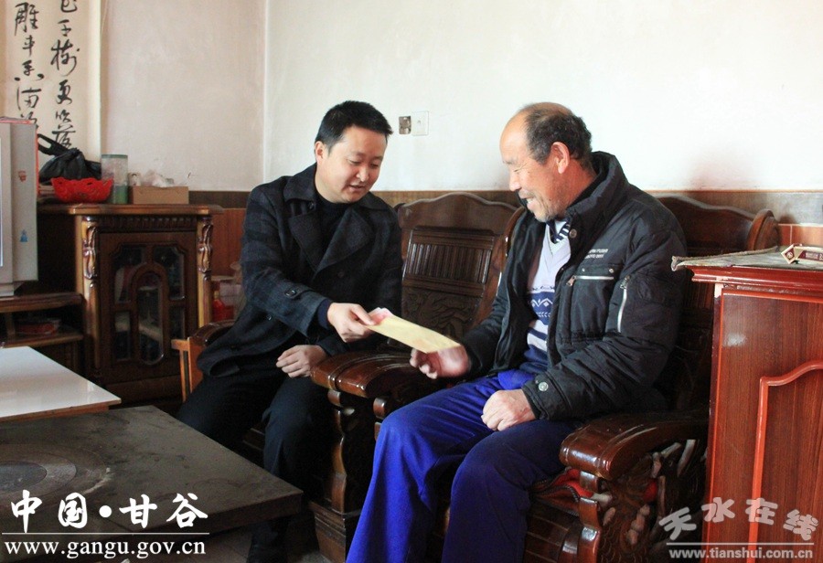 1月19日,甘谷縣副縣長(zhǎng)楊宏深入大莊鎮(zhèn)付家河村、大莊村等地,走訪慰問(wèn)困難群眾,為他們送去了慰問(wèn)金,帶去了黨和政府的溫暖關(guān)懷與新春祝福。
