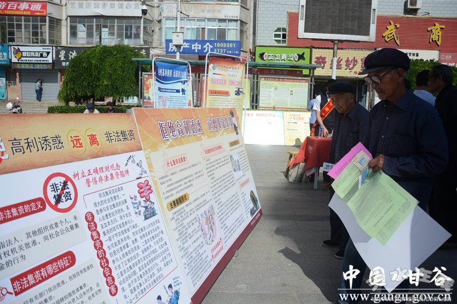 為了進(jìn)一步做好全縣防范和打擊非法集資宣傳工作,從源頭上有效遏制非法集資,6月6日,甘谷縣政府金融辦牽頭,組織縣公安局、商務(wù)局、財(cái)政局、檢察院等部門單位在大十字廣場(chǎng)開展防范和打擊非法集資宣傳教育活動(dòng)?h委常委、副縣長(zhǎng)王志高參加宣傳活動(dòng)。