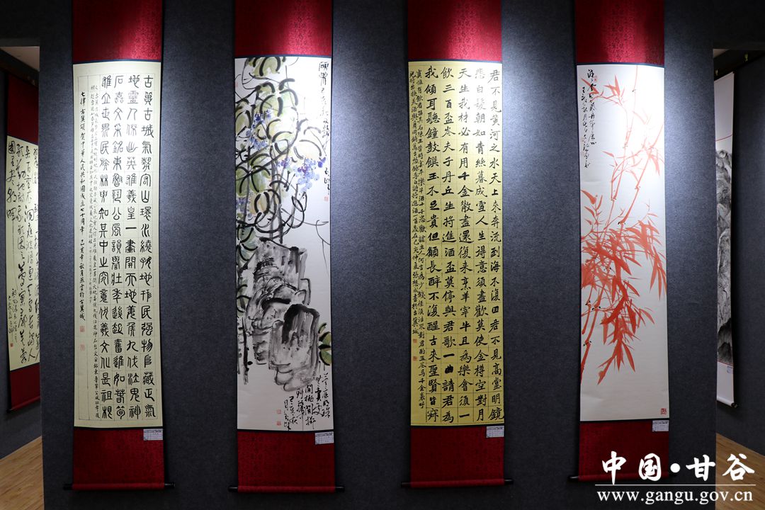 據(jù)了解,慶祝新中國成立70周年經(jīng)濟社會發(fā)展暨脫貧攻堅成就展,以豐富詳實的圖文資料,從不同時期、不同角度,展示了70年來特別是黨的十八大以來甘谷縣經(jīng)濟、政治、文化、生態(tài)、社會、黨的建設(shè)和脫貧攻堅等方面取得的顯著成就,記錄了全縣人民團結(jié)一心、劈波斬浪的奮斗足跡,展示了廣大干部群眾對全面建成小康社會、建設(shè)富裕文明和諧美麗新甘谷的良好精神風貌。展覽分為2個大的板塊,其中,經(jīng)濟社會發(fā)展成就展共設(shè)序言、光輝歷程、砥礪奮進、多彩鄉(xiāng)鎮(zhèn)、展望未來、結(jié)束語等6個篇章100個展板。脫貧攻堅成就展分前言、工作成效、領(lǐng)導關(guān)懷、基礎(chǔ)建設(shè)、富民產(chǎn)業(yè)、公共服務、抓黨建促脫貧、扶貧領(lǐng)域作風建設(shè)、特色亮點和各鄉(xiāng)鎮(zhèn)展板等10個篇章82個展板。 “不忘初心、牢記使命”主題教育書畫展共展出70余位書畫家精心創(chuàng)作的70余幅作品,主題明確、題材廣泛、立意新穎,具有鮮明的時代特征和較高的藝術(shù)水準,從不同側(cè)面、不同角度反映新中國成立70年來甘谷發(fā)生的巨大變化,展現(xiàn)了全縣干部群眾奮發(fā)有為的精神面貌。