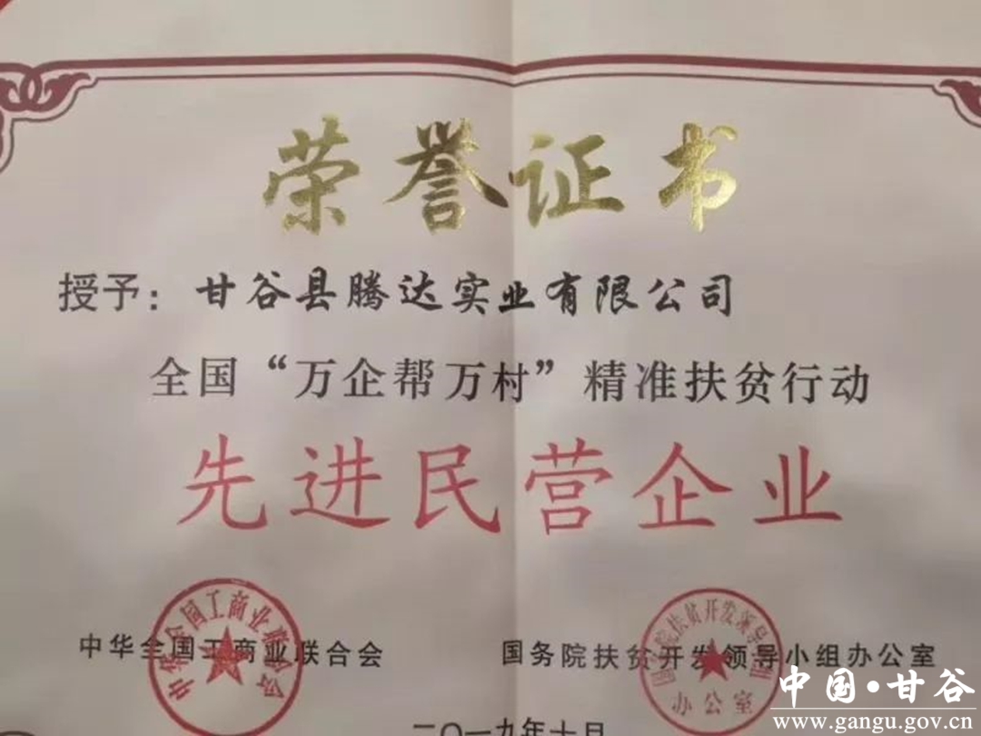 為深入貫徹落實(shí)習(xí)近平總書(shū)記給“萬(wàn)企幫萬(wàn)村”行動(dòng)中受表彰民營(yíng)企業(yè)家重要回信精神,全國(guó)工商聯(lián)、國(guó)務(wù)院扶貧辦決定授予全國(guó)99家民營(yíng)企業(yè)“萬(wàn)企幫萬(wàn)村”精準(zhǔn)扶貧行動(dòng)先進(jìn)民營(yíng)企業(yè)稱(chēng)號(hào)。甘谷縣騰達(dá)實(shí)業(yè)有限公司入選,其董事長(zhǎng)張維林于2019年10月17號(hào)在北京參加表彰大會(huì)并領(lǐng)獎(jiǎng)。