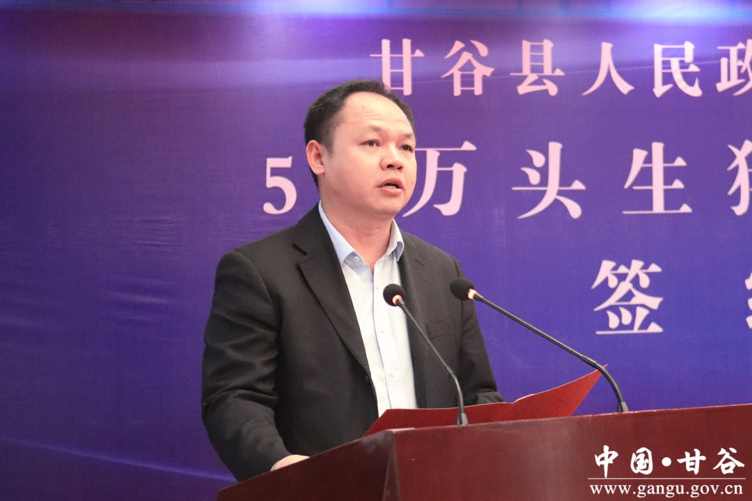 簽約儀式由縣委副書記孟曉龍主持?h委副書記、縣長吳健代表甘谷縣人民政府與唐人神集團股份有限公司甘肅大區(qū)總裁劉習(xí)功共同簽訂了《甘谷唐人神50萬頭生豬綠色養(yǎng)殖項目投資框架協(xié)議》。