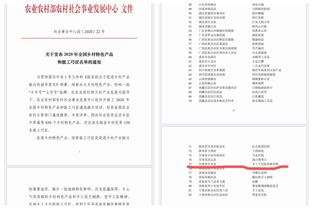 近日,農(nóng)業(yè)農(nóng)村部公布2020年全國鄉(xiāng)村特色產(chǎn)品和能工巧匠名單,甘谷雅路人麻編鞋業(yè)有限公司手工千層底亞麻布鞋入選全國特色手工產(chǎn)品。