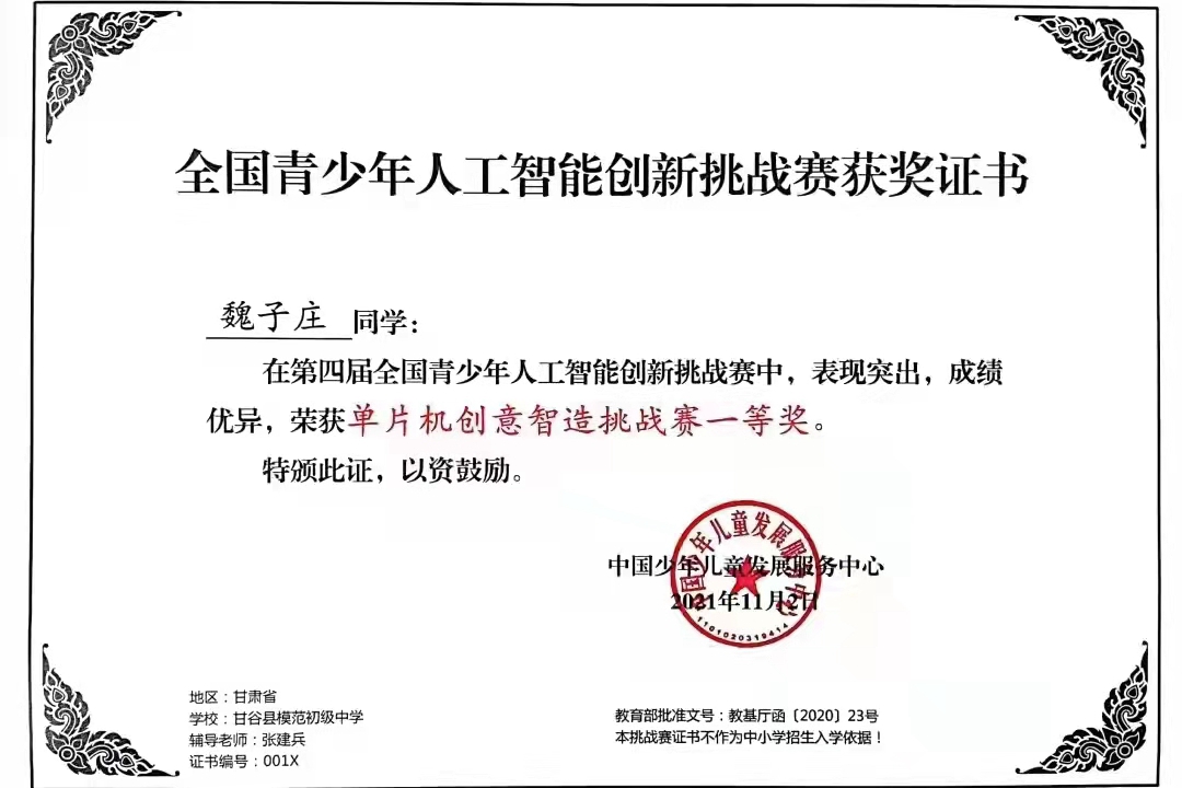 據悉,甘谷縣模范初級中學學生魏子莊、南街小學學生丁桐代表甘肅省參加“第四屆全國青少年人工智能創(chuàng)新挑戰(zhàn)賽”全國總決賽,在單片機創(chuàng)意智造挑戰(zhàn)賽中魏子莊同學榮獲一等獎、丁桐同學榮獲三等獎,模范初級中學教師張建兵榮獲全國優(yōu)秀輔導獎。