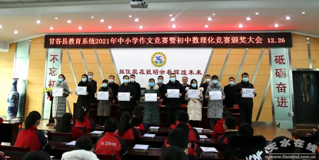 12月26日,甘谷縣教育局組織召開2021年中小學(xué)作文競(jìng)賽暨初中數(shù)理化競(jìng)賽頒獎(jiǎng)大會(huì),對(duì)作文競(jìng)賽和學(xué)科競(jìng)賽中表現(xiàn)突出的231名學(xué)生和200余名老師進(jìn)行了表彰。教育局領(lǐng)導(dǎo)班子,高中階段學(xué)校分管領(lǐng)導(dǎo),各學(xué)區(qū)、縣直義務(wù)教育階段學(xué)校校長(zhǎng),學(xué)科競(jìng)賽獲獎(jiǎng)學(xué)生代表和指導(dǎo)教師代表,共計(jì)70余人參加了頒獎(jiǎng)大會(huì)。大會(huì)由縣委教育工委副書記、局黨組副書記張勝平主持。縣委教育工委書記、局黨組書記、局長(zhǎng)李果香就進(jìn)一步加強(qiáng)全縣文科術(shù)科建設(shè)作了總結(jié)講話。