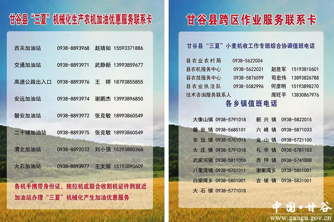 甘谷縣農(nóng)業(yè)農(nóng)村局和交通、氣象、石油、應(yīng)急等部門(mén)成立了“三夏”專(zhuān)班,建立跨區(qū)作業(yè)服務(wù)站1個(gè)(縣高速收費(fèi)站),農(nóng)機(jī)加油服務(wù)站8個(gè)(全縣所有中石油加油站)。在跨區(qū)作業(yè)服務(wù)站對(duì)來(lái)甘谷參加“三夏”的跨區(qū)作業(yè)的車(chē)輛(機(jī)械)實(shí)施高速免費(fèi)通行,并進(jìn)行信息登記、發(fā)放農(nóng)機(jī)作業(yè)安全資料、提供服務(wù)電話、農(nóng)機(jī)加油優(yōu)惠3%政策資料及《致參加2023年甘谷縣小麥機(jī)收作業(yè)農(nóng)機(jī)手的一封信》。同時(shí)在全縣農(nóng)機(jī)服務(wù)微信群等線上線下各平臺(tái)對(duì)參與“三夏”農(nóng)業(yè)生產(chǎn)的機(jī)手進(jìn)行小麥機(jī)收減損、安全教育、優(yōu)惠政策、檢修服務(wù)等宣傳。截止20日下午已登記來(lái)甘谷跨區(qū)作業(yè)機(jī)械4臺(tái),目前“三夏”工作正在有序推進(jìn)中。
