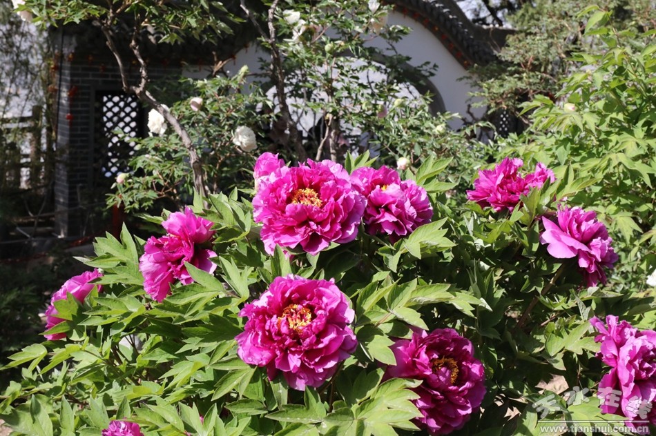 據(jù)歷史資料介紹,甘谷天門山巔的東岳廟,始山上建于秦漢,重建于宋仁宗天圣年間(公元1023—公元1031年),廟院內(nèi)的兩株牡丹,植于北宋仁宗年間,距今約1000年,是珍貴文物樹木。歷代詩人吟詠者眾多,留下了不少千古絕唱和膾炙人口的名篇佳句。清乾隆《伏羌縣志》藝文卷中有淮海續(xù)縉《伏羌雜記》詩中以“色欲天仙艷,紅歸芍藥妝”詠唱當時盛開的牡丹。