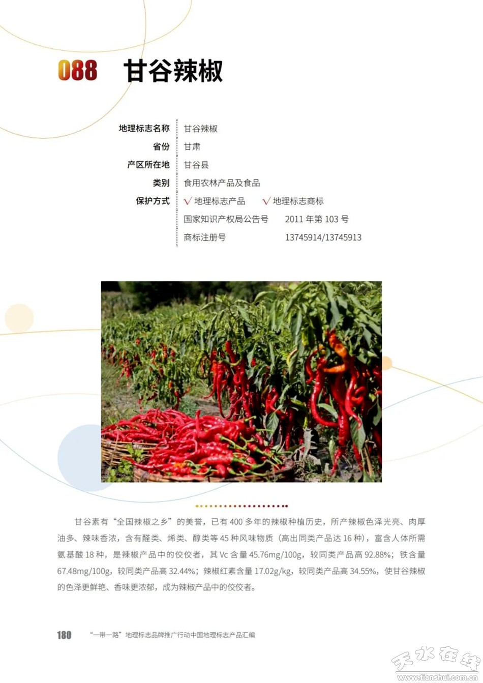 甘谷素稱“辣椒之鄉(xiāng)”,辣椒種植有400多年的歷史,明葉應甲所編《伏羌縣志》(1627年)中就有甘谷辣椒的記載,曾作為明未清初的宮廷貢品而享譽隴上。甘谷辣椒因色澤紅亮,肉厚油多,味道濃郁,營養(yǎng)豐富,在國內(nèi)外享有很高聲譽。2011年被原國家質(zhì)檢總局認定為地理標志保護產(chǎn)品,2014年成功注冊為國家地理標志證明商標,2023年入選國家知識產(chǎn)權(quán)局第二批地理標志運用促進重點聯(lián)系指導名錄。