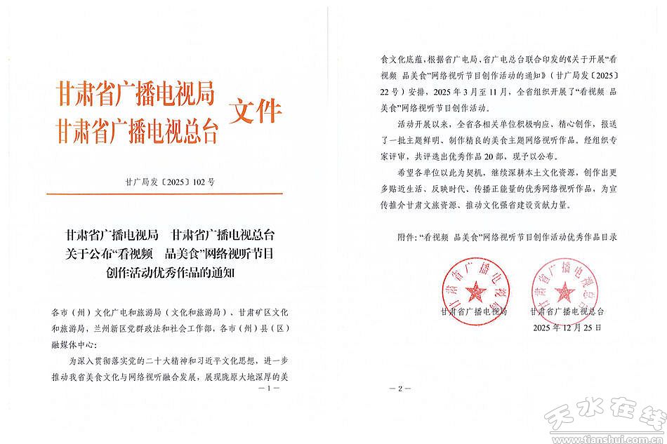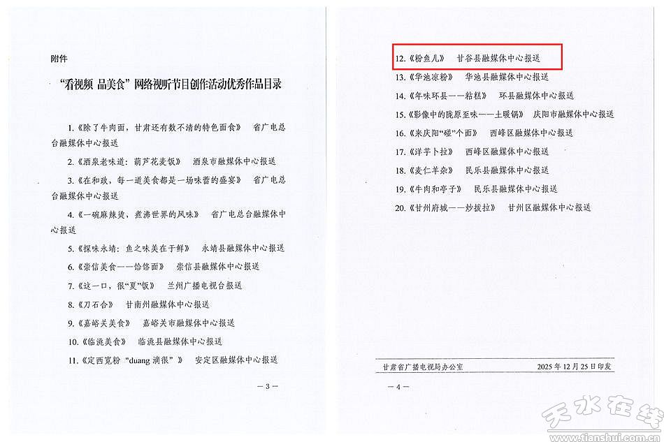 新甘谷訊近日,甘肅省廣播電視局、省廣播電視總臺公布“看視頻品美食”網(wǎng)絡(luò)視聽節(jié)目創(chuàng)作活動優(yōu)秀作品名單,甘谷縣融媒體中心報送的短視頻《粉魚兒》成功入選。