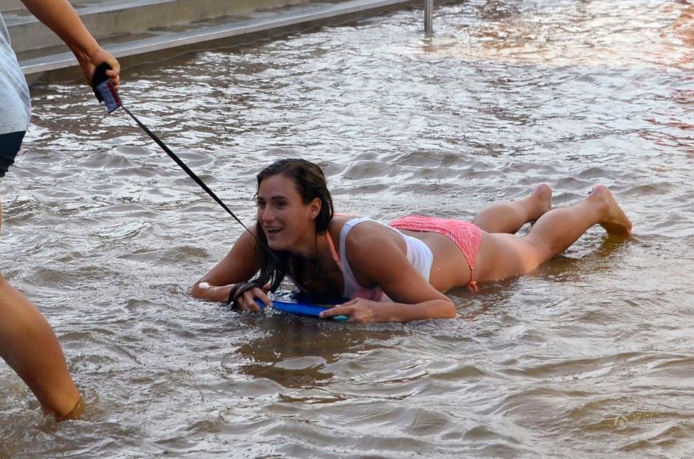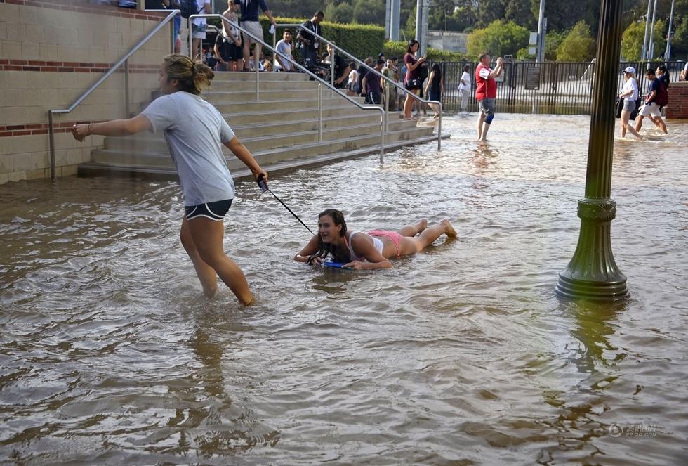 7月29日,由于主水管破裂,美國加州洛杉磯街區(qū)以及加州大學(xué)洛杉磯分校遭水淹沒,主水管每分鐘涌出的水量高達(dá)7.5萬加侖(約284立方米),校園里的主要街道和建筑遭到水淹。圖為“水災(zāi)”發(fā)生后,女學(xué)生在積水中戲水。