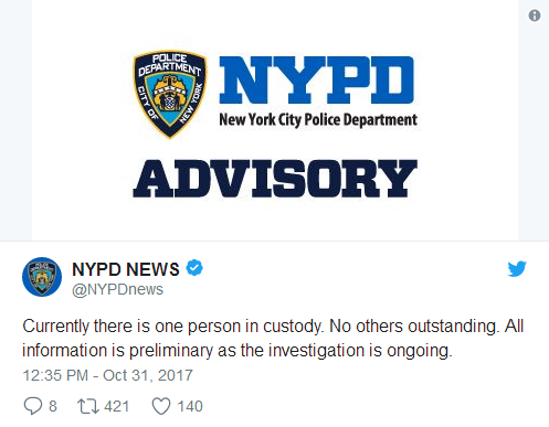 知情人士表示,該事件正被視為恐襲進(jìn)行調(diào)查,嫌犯來自烏茲別克斯坦。有目擊者稱嫌疑人在現(xiàn)場高喊“真主至上”。FBI正接手領(lǐng)導(dǎo)調(diào)查。