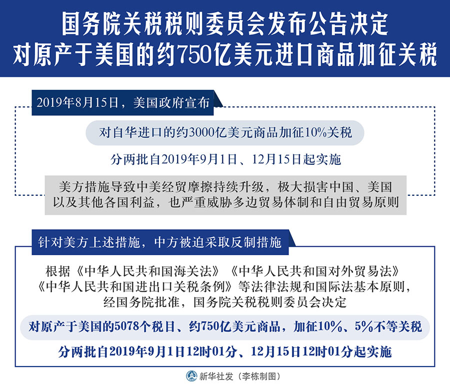 針對美方上述措施,中方被迫采取反制措施。根據(jù)《中華人民共和國海關(guān)法》《中華人民共和國對外貿(mào)易法》《中華人民共和國進(jìn)出口關(guān)稅條例》等法律法規(guī)和國際法基本原則,經(jīng)國務(wù)院批準(zhǔn),國務(wù)院關(guān)稅稅則委員會決定,對原產(chǎn)于美國的5078個(gè)稅目、約750億美元商品,加征10%、5%不等關(guān)稅,分兩批自2019年9月1日12時(shí)01分、12月15日12時(shí)01分起實(shí)施。