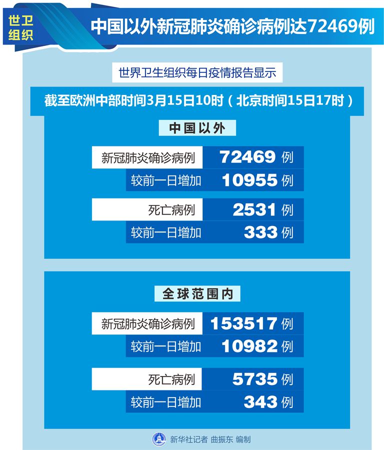 世衛(wèi)組織每日疫情報告顯示,截至歐洲中部時間15日10時(北京時間15日17時),中國以外新冠肺炎確診病例較前一日增加10955例,達(dá)到72469例;中國以外死亡病例較前一日增加333例,達(dá)到2531例。