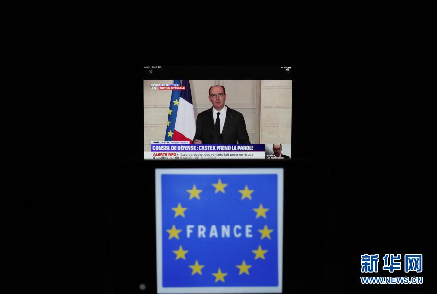 這是1月30日在法國(guó)巴黎拍攝的法國(guó)總理卡斯泰的新聞發(fā)布會(huì)視頻畫面以及法國(guó)邊界標(biāo)志牌的照片。新華社記者 高靜 攝