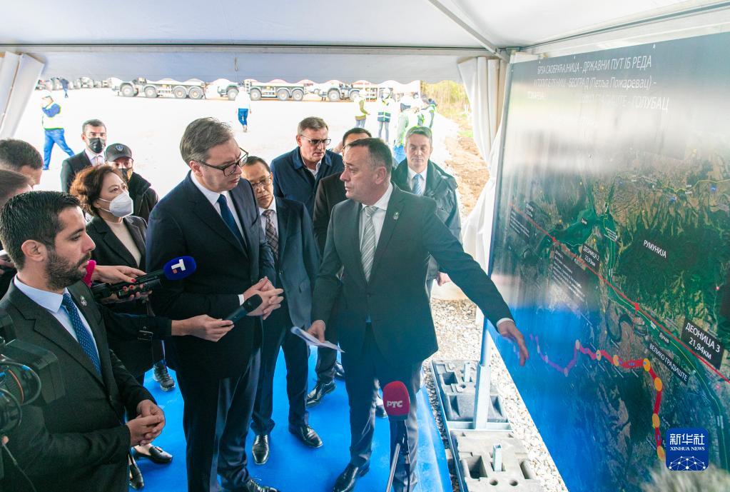 11月5日,在塞爾維亞東部城市波扎雷瓦茨,塞爾維亞總統(tǒng)武契奇(中左)出席中企承建的“多瑙走廊”項目開工儀式。新華社發(fā)(王韡攝)