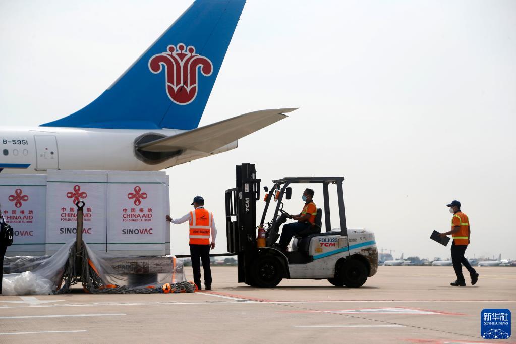 11月17日,工作人員在柬埔寨金邊國際機(jī)場運(yùn)輸中國援柬第七批新冠疫苗。新華社發(fā)(批隆攝)