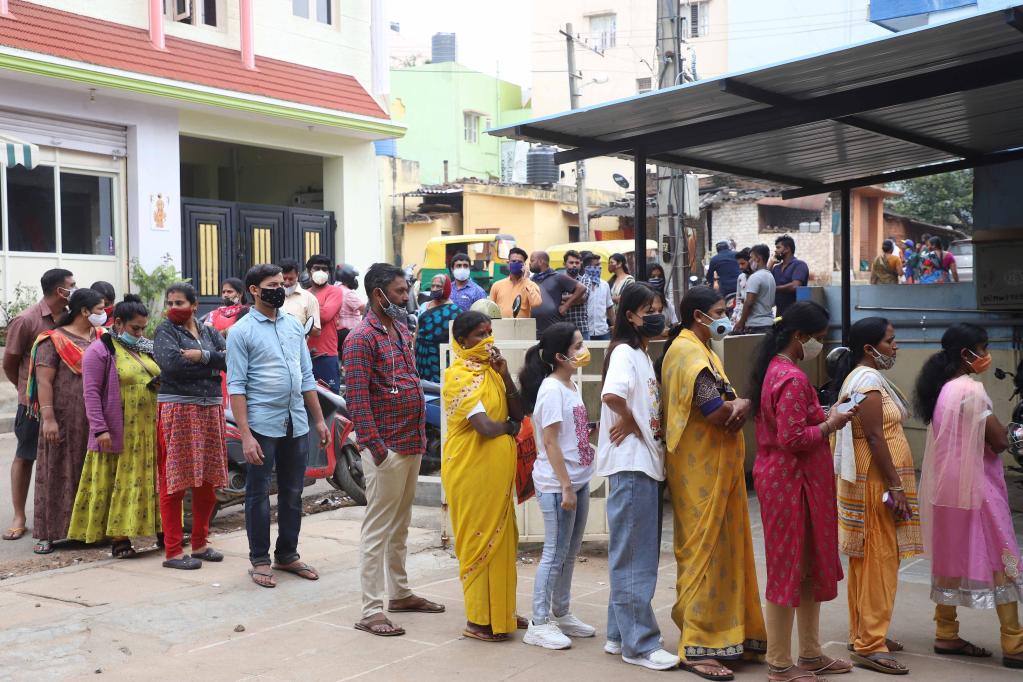 2021年12月3日,人們在印度班加羅爾排隊等待接種新冠疫苗。(新華社發(fā))