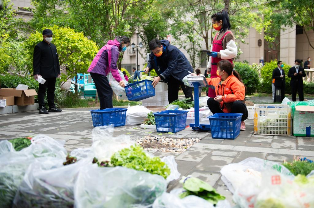 4月28日,在北京市朝陽區(qū)和平村一社區(qū)蔬菜直通車售賣點,居民(左二)在購買蔬菜。(新華社記者陳鐘昊攝)