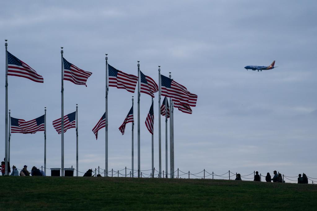 11月10日,在美國首都華盛頓,一架飛機(jī)從美國國旗上空飛過。新華社記者劉杰攝