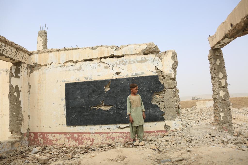 2021年8月23日,在阿富汗南部赫爾曼德省桑金地區(qū),一名男孩站在廢墟之中。桑金地區(qū)曾經(jīng)最繁華的市場(chǎng),如今遍布美軍空襲留下的一個(gè)個(gè)巨大彈坑。新華社發(fā)(塞夫拉赫曼·薩菲 攝)