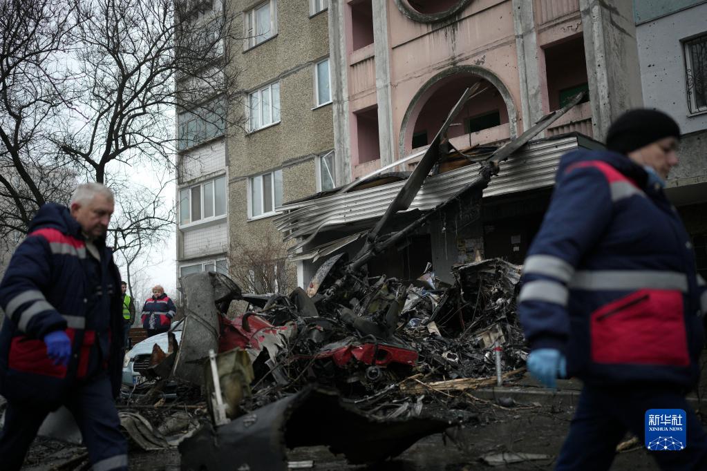 1月18日,救援人員在烏克蘭基輔市東郊的布羅瓦雷的直升機(jī)墜機(jī)現(xiàn)場(chǎng)工作。新華社/美聯(lián)