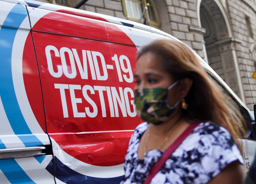 2021年9月6日,一名女子從美國紐約的移動新冠檢測點旁經過。(新華社記者王迎攝)