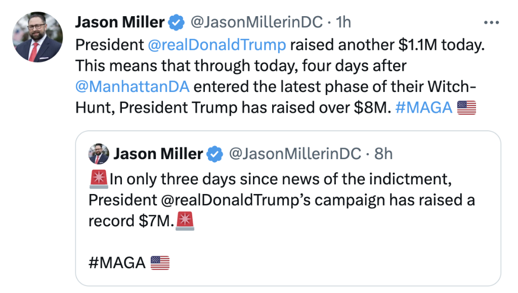特朗普競(jìng)選團(tuán)隊(duì)高級(jí)顧問賈森·米勒3日在社交媒體上宣布,自特朗普被刑事起訴的決定公布以來(lái),該團(tuán)隊(duì)已募集800萬(wàn)美元競(jìng)選資金。
