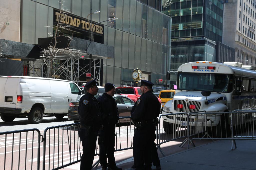 4月3日,當(dāng)?shù)鼐煸谔乩势沾髲B前執(zhí)勤。特朗普當(dāng)天抵達(dá)紐約后入住這里。新華社記者劉亞南攝