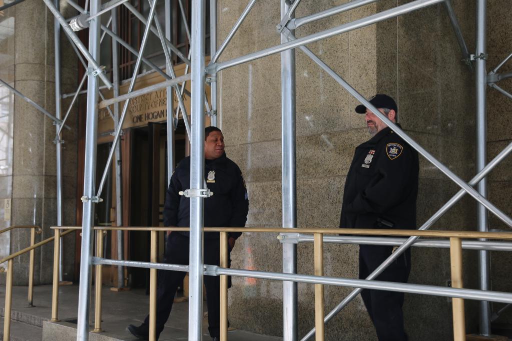 當(dāng)?shù)貢r(shí)間3日上午,記者看到,曼哈頓地區(qū)檢察官辦公室和刑事法院共同所在的大樓周圍已設(shè)置了更多柵欄,部分路段設(shè)置的還是雙層?xùn)艡冢淮髽浅鋈肟诤透浇煌房诰芯熘凳;大樓外還有身著防彈背心的法警。