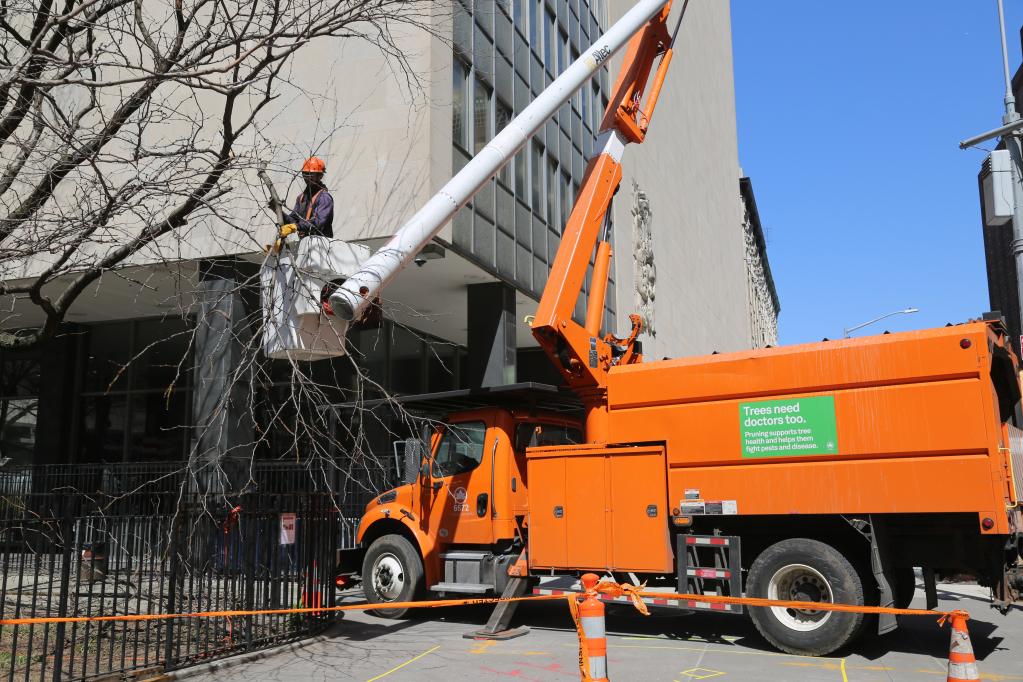 當(dāng)天中午,執(zhí)法人員和公園管理方協(xié)商安全事宜,很快安排了一輛作業(yè)車為一棵大樹剪枝,避免樹枝遮擋旁邊一個(gè)監(jiān)控?cái)z像頭。