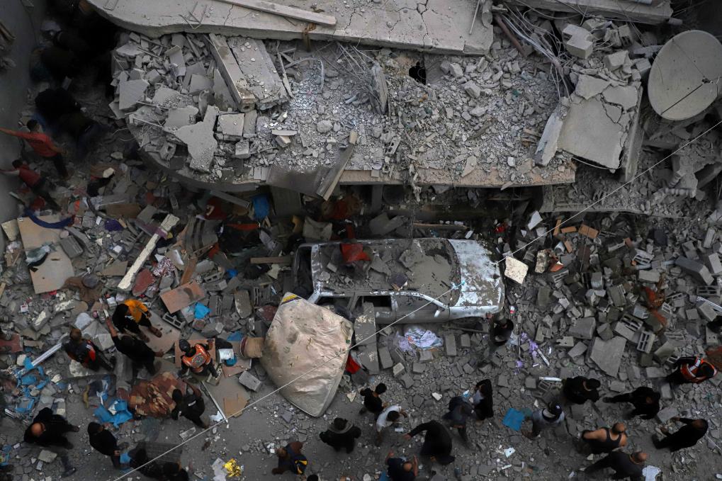 12月7日,在加沙地帶南部城市汗尤尼斯,巴勒斯坦人查看遭以軍襲擊后的建筑廢墟。新華社發(fā)(里澤克·阿卜杜勒賈瓦德攝)