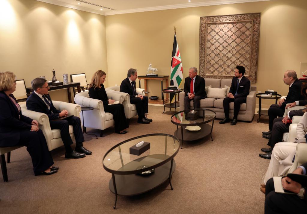 1月7日,約旦國王阿卜杜拉二世(中右)在安曼會見到訪的美國國務(wù)卿布林肯(中左)。新華社發(fā)(約旦王宮供圖)