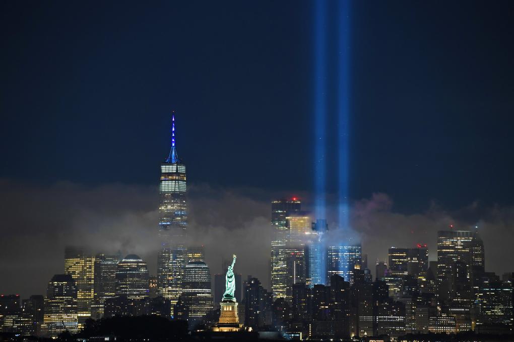 2023年9月11日晚,美國(guó)紐約世貿(mào)中心遺址附近亮起象征紐約世貿(mào)中心“雙子塔”大廈的光柱,紀(jì)念“9·11”恐怖襲擊事件二十二周年。新華社記者李睿攝