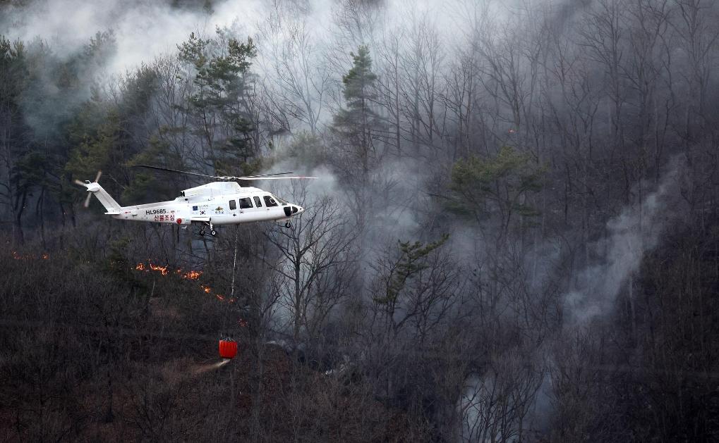 3月22日,救援直升機在韓國慶尚北道義城郡附近參與滅火。新華社/紐西斯通訊社