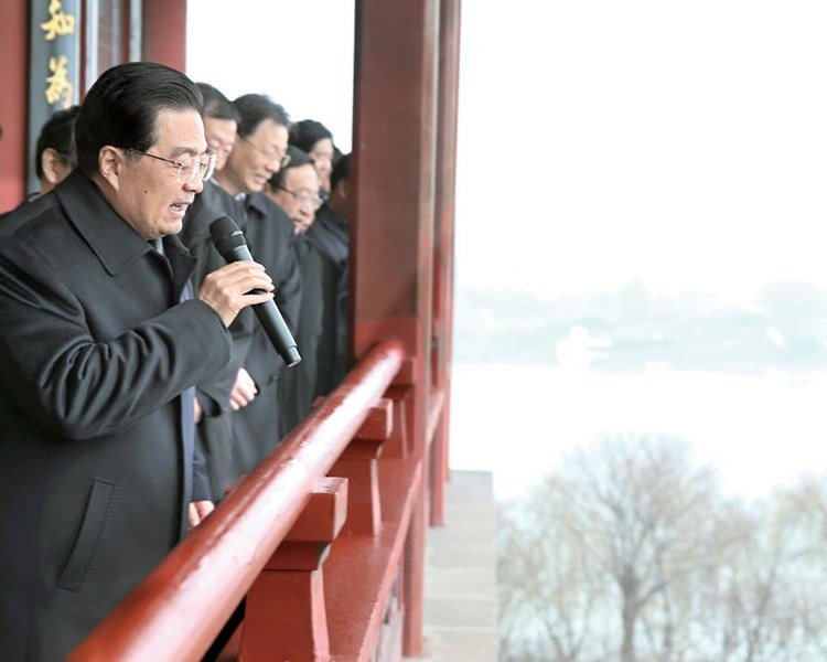 在泰州期間,胡主席登上望海樓、俯瞰泰州城、察看城河水、重回稻河頭、走進(jìn)科學(xué)發(fā)展展示館,與家鄉(xiāng)人民敘鄉(xiāng)情、話發(fā)展。圖為“鄉(xiāng)親們好!謝謝大家!”胡錦濤在望海樓上向市民問好。