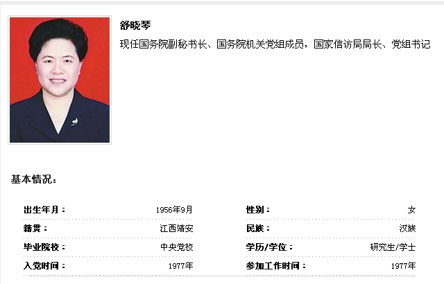 舒曉琴,女,漢族,1956年9月出生,江西靖安人。1977年4月入黨,1977年7月參加工作,中央黨校研究生學(xué)歷,法學(xué)學(xué)士,副總警監(jiān)。歷任江西宜春團(tuán)地委副書記(主持工作),萬載縣委常委、常務(wù)副縣長,高安縣委副書記、縣長,宜春地委委員、宜春市(縣)委書記,景德鎮(zhèn)市委副書記、市長、市委書記。2001年12月任江西省委常委、政法委書記。2007年12月任江西省委常委、政法委書記,省公安廳黨委書記。2008年1月任江西省委常委、政法委書記,省公安廳廳長、黨委書記,武警江西省總隊(duì)第一政委、第一書記。2013年4月任國務(wù)院副秘書長、國務(wù)院機(jī)關(guān)黨組成員,國家信訪局局長、黨組書記。