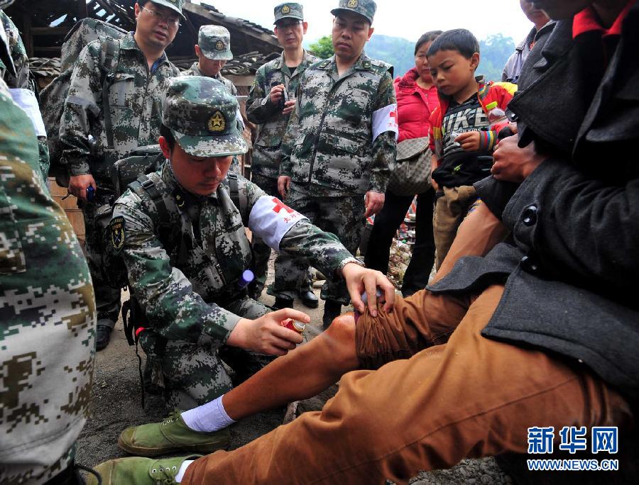 4月22日,在地震重災(zāi)區(qū)蘆山縣寶盛鄉(xiāng)玉溪村,國家級醫(yī)療救援隊第三軍醫(yī)大學(xué)大坪醫(yī)院的救護人員在對村民進行救治。當(dāng)日是四川省蘆山“4·20”7.0級強烈地震后的第三日。 新華社記者肖藝九攝 |