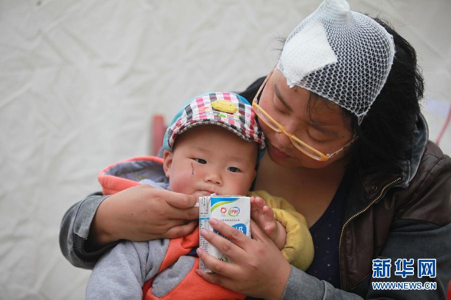 4月22日,蘆山縣人民醫(yī)院里,來自蘆山縣蘆陽鎮(zhèn)的李鑫昕正在給一歲的孩子喂奶。當(dāng)日是四川省蘆山“4·20”7·0級強烈地震后的第三日。 新華社記者 金立旺攝