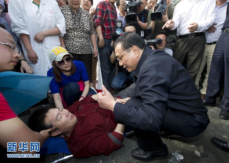 4月20日下午,李克強(qiáng)一到蘆山縣,首先來(lái)到縣醫(yī)院看望地震中受傷的群眾。得知一名記者在挺進(jìn)災(zāi)區(qū)采訪時(shí)被飛石擊中大腿受傷,李克強(qiáng)說(shuō),謝謝你,你履行了一個(gè)記者的職責(zé),不光是報(bào)道災(zāi)情,還沖到危險(xiǎn)地方去救災(zāi),體現(xiàn)了新聞工作者群體的職業(yè)道德和精神理念。新華社記者 黃敬文 攝
