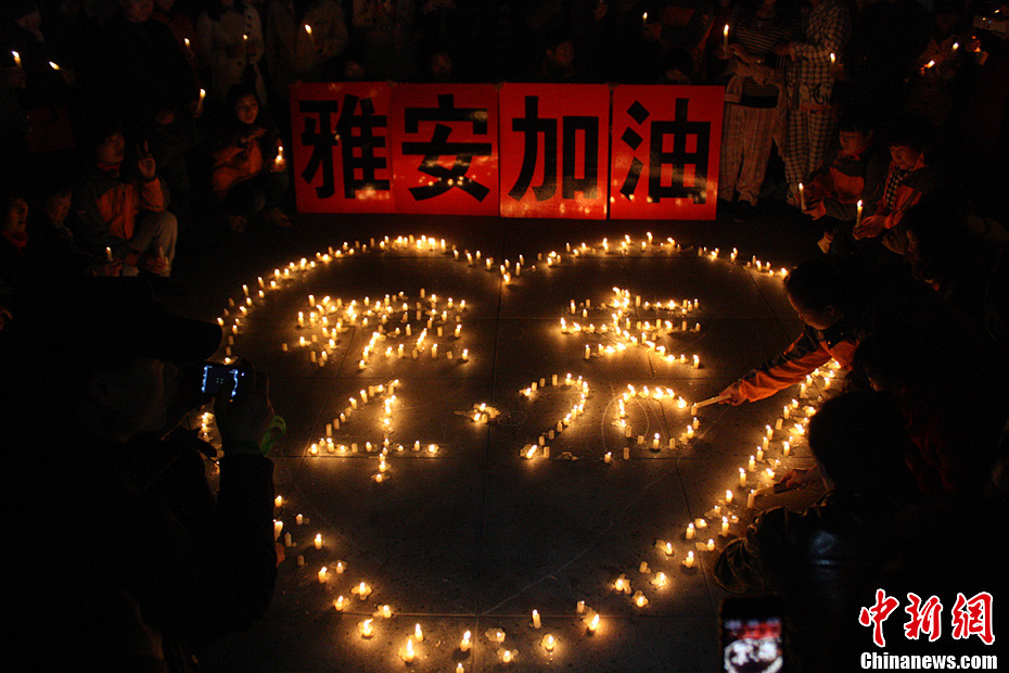 4月22日晚間,江蘇鹽城近百位市民來到市區(qū)鹽瀆公園為雅安人民祈;顒樱忻裼孟灎T擺上“雅安”、“4.20”字樣,為災區(qū)同胞祈福。圖為用蠟燭組成的“雅安”、“4.20”字樣。谷華 攝