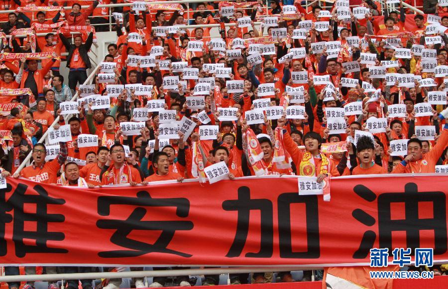 4月20日,在2013賽季中國足球超級聯(lián)賽第6輪比賽中,山東魯能主場對陣遼寧宏運,現(xiàn)場球迷為雅安地震災區(qū)同胞祈福加油。當日8時02分,四川省雅安市蘆山縣發(fā)生7.0級地震。災情牽動著億萬同胞的心,人們用不同的方式為雅安地震災區(qū)人民祈福,哀悼地震遇難同胞。截至20日16時40分,雅安蘆山地震已造成四川113人死亡。新華社發(fā)