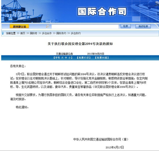 3月7日,聯(lián)合國安理會通過關于朝鮮核試驗問題的第2094號決議。該決議譴責朝鮮違反安理會決議進行核試;在安理會以往對朝制裁決議基礎上,針對朝核、導計劃強化有關金融制裁、敏感物資禁運等措施;在定向制裁清單上增列3名朝公司駐華代表,朝鮮綜合設備進口會社、第二自然科學院等2個實體,在禁運清單上增列8項核、導、生化武器物項,以及游艇、豪華汽車、貴重珠寶等奢侈品(詳見聯(lián)合國安理會第2094號決議)。