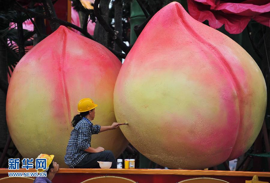 9月22日,一名施工人員在北京天安門廣場正在搭建的“花果籃”里為大“壽桃”上色。 北京天安門廣場國慶花壇搭建工作目前正在進行。新華社記者 陳曄華 攝