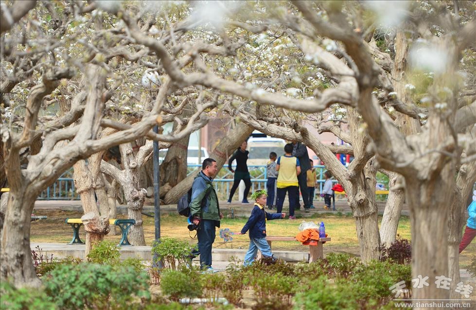 4月6日,一位市民帶著孩子漫步在梨園中。 當(dāng)日是清明小長假的第二天,新疆南部“梨城”庫爾勒市梨花競相綻放,當(dāng)?shù)厥忻窦娂娮叱鰬敉庀硎芗偃沾汗狻?nbsp;新華社記者 江文耀 攝