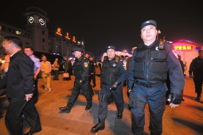 昨晚,公安部副部長、北京市委常委、市公安局局長傅政華(右二)佩槍巡邏火車站。京華時(shí)報(bào)記者陶冉攝