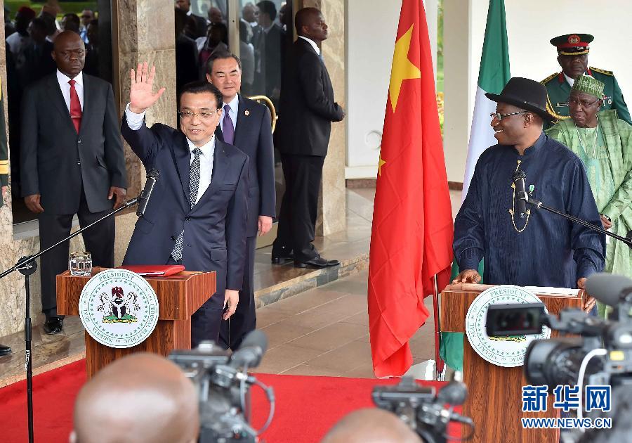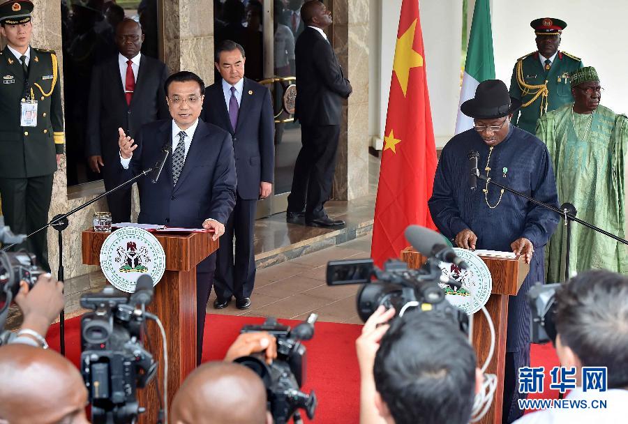 5月7日,中國國務院總理李克強在阿布賈與尼日利亞總統(tǒng)喬納森會談后共同會見記者,并回答記者提問。 新華社記者李濤攝