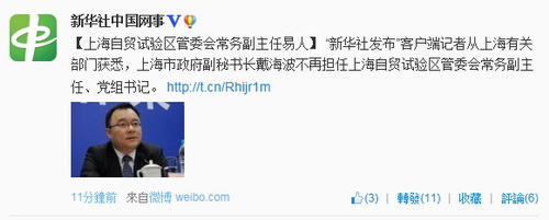 戴海波同時還擔(dān)任上海口岸工作領(lǐng)導(dǎo)小組秘書長。上周五,他還主持了上海口岸工作領(lǐng)導(dǎo)小組的一次會議,但是在事后的官方新聞稿件中隱去了他自貿(mào)區(qū)管委會副主任的身份。由此外界判斷,此時他在自貿(mào)區(qū)的職務(wù)或許已遭免除。