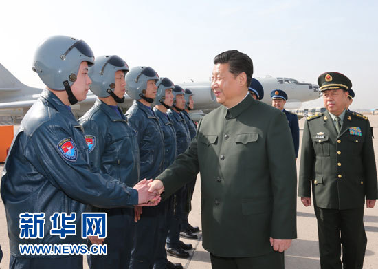 在飛行準(zhǔn)備室,習(xí)近平觀看了空軍航空兵某師部隊建設(shè)匯報短片,觀摩了導(dǎo)彈模擬訓(xùn)練演示。隨后,他來到機場停機坪,認真察看各型戰(zhàn)機和機載武器,實地考察部隊練兵備戰(zhàn)成果。某新型轟炸機前,飛行機組和機務(wù)人員整齊列隊,習(xí)近平走上前去,同大家一一握手,詳細詢問學(xué)習(xí)、工作和訓(xùn)練情況。他登上戰(zhàn)機,坐進駕駛艙,了解裝備性能,體驗操作使用。習(xí)近平勉勵大家按照“地面苦練、空中精飛”的要求摔打磨礪自己,以極端負責(zé)的精神精心維護保障戰(zhàn)機,不斷提高技戰(zhàn)術(shù)水平,做到一旦有事就能聞令而動、克敵制勝。