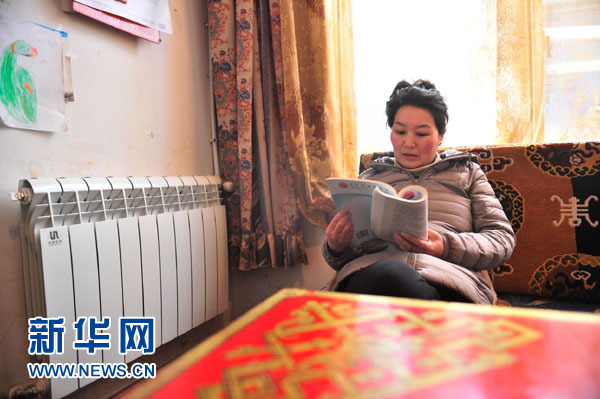 拉薩市當巴社區(qū)尼威安居苑居民措姆在家中暖氣旁看書(2014年12月26日攝)。作為西藏自治區(qū)拉薩市供暖試點工程首個用上天然氣供暖的小區(qū),尼威安居苑266戶居民在2014年全部用上了天然氣供暖,告別千年牛糞取暖。新華社記者劉坤攝