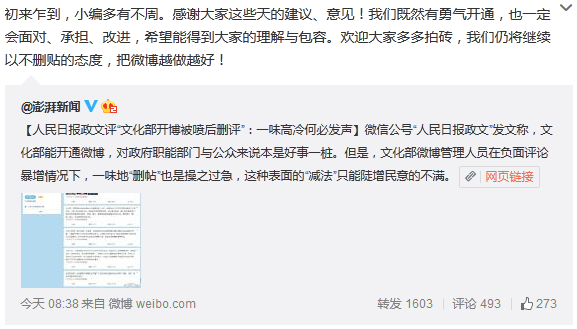 人民日報政文評“文化部開博被噴后刪評”:一味高冷何必發(fā)聲