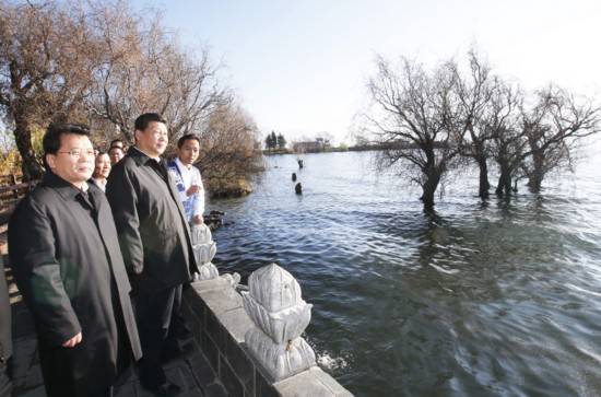 2015年1月20日,習(xí)近平來到大理白族自治州大理市灣橋鎮(zhèn)古生村,仔細(xì)察看洱海邊的生態(tài)保護(hù)濕地。新華社記者 鞠鵬 攝